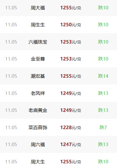 周大福等知名黄金品牌已宣布上调金价。 11月3日,周大福足金首饰为1259元/克,较前一日上涨61元/克。老庙黄金、周生生等单日涨幅超过5%;中国黄金一度上调78元/克,单日涨幅超6%。部分消费者产生疑惑:“这是否由新规导致?”